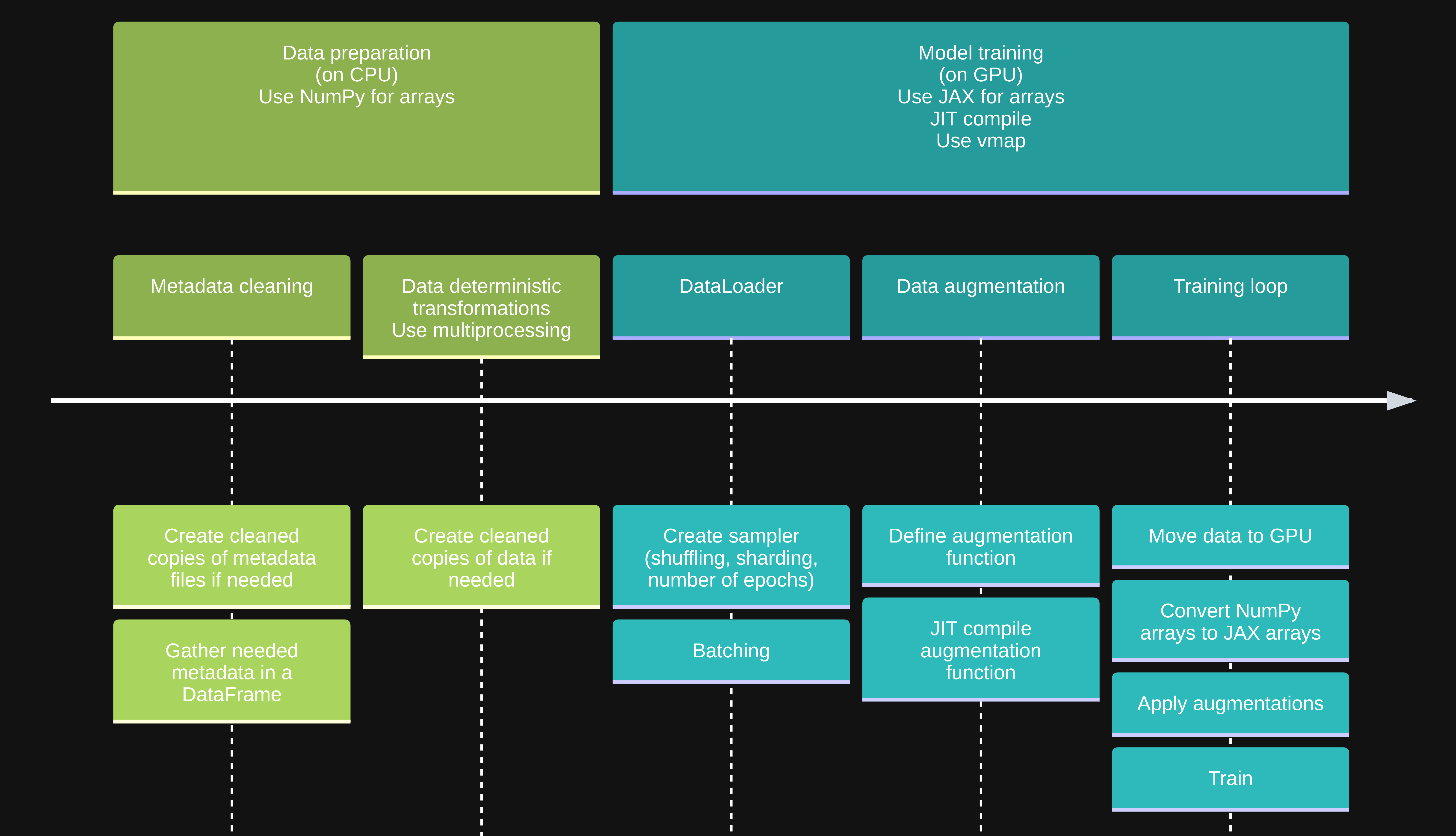 In particular, it is important to consider what should run on CPUs vs GPUs and what is part of the preliminary work (sometimes called “offline”) and what constitutes the actual training (“online”).