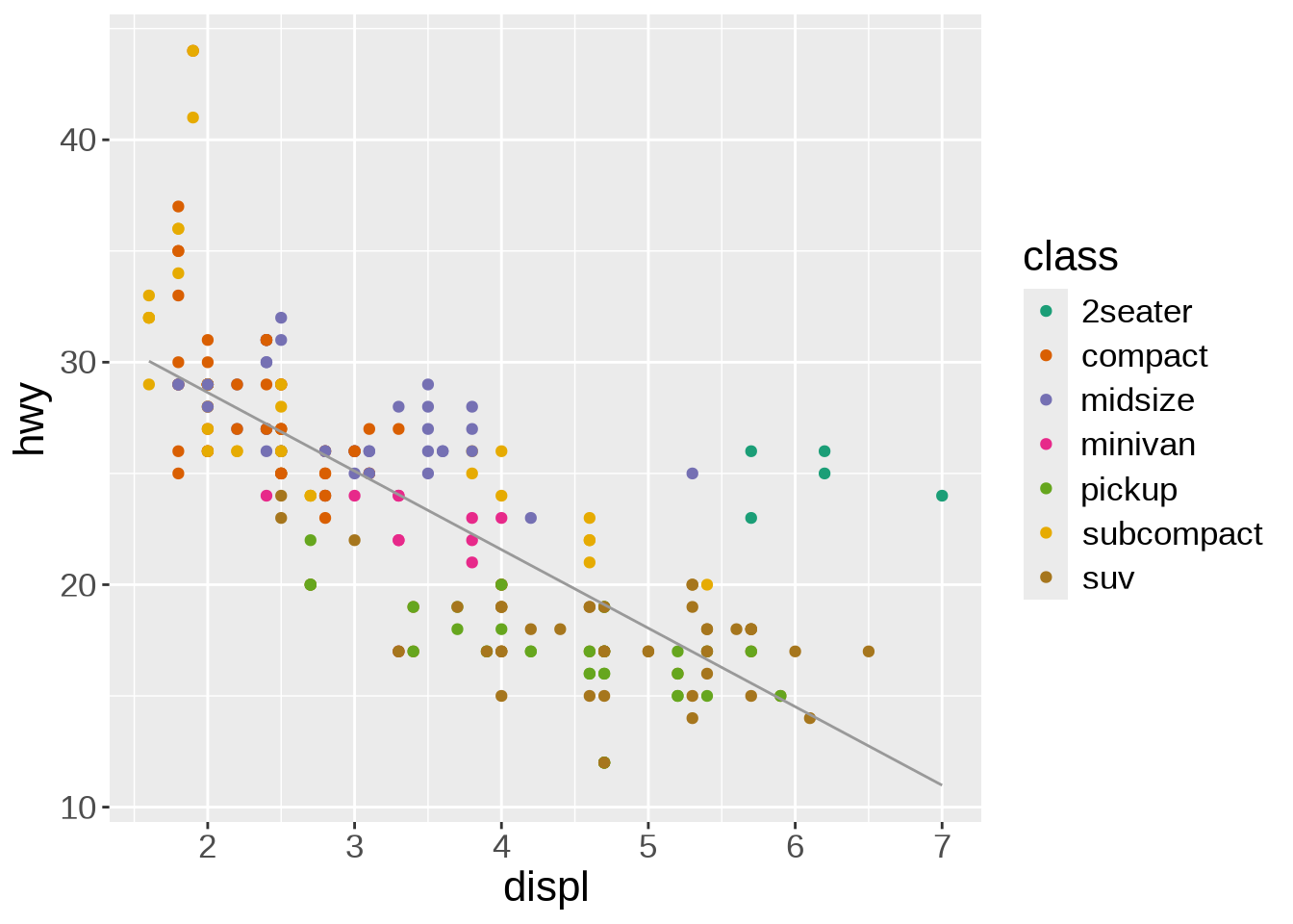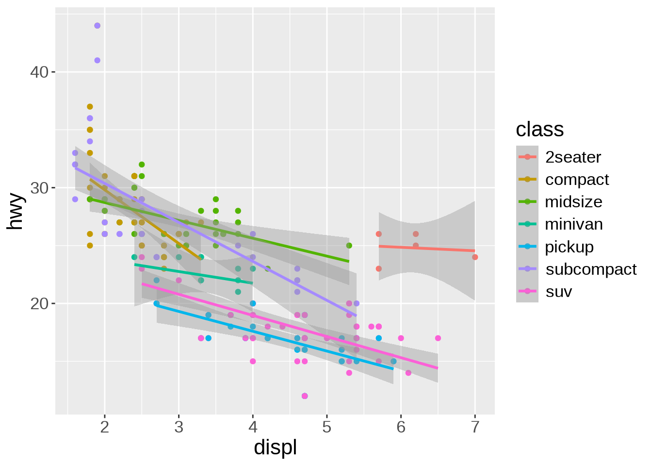 We can apply the smoothing function to each class instead of the entire data. It creates a busy plot but shows that the downward trend remains true within each type of car: