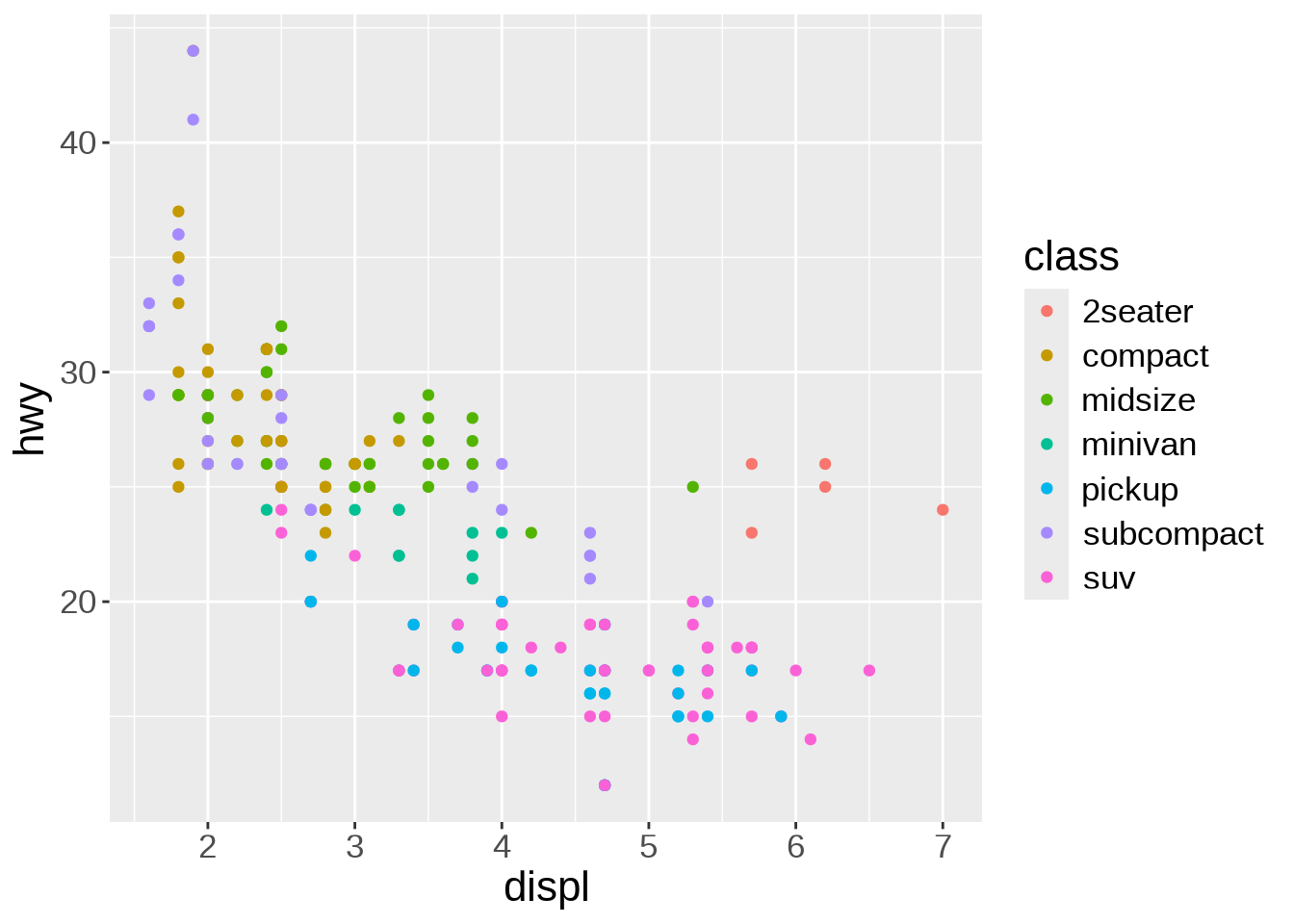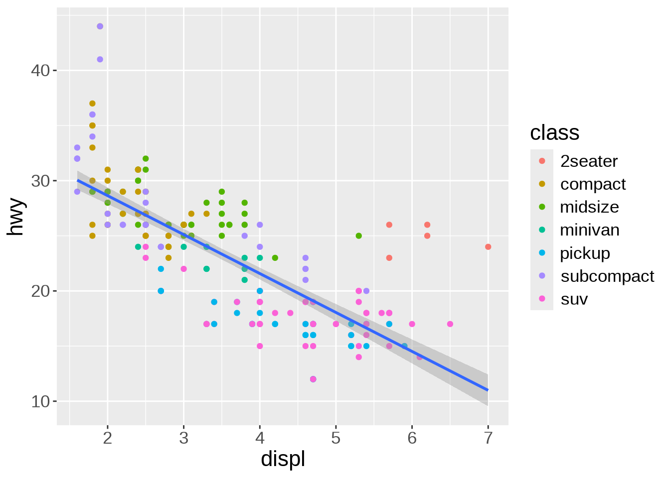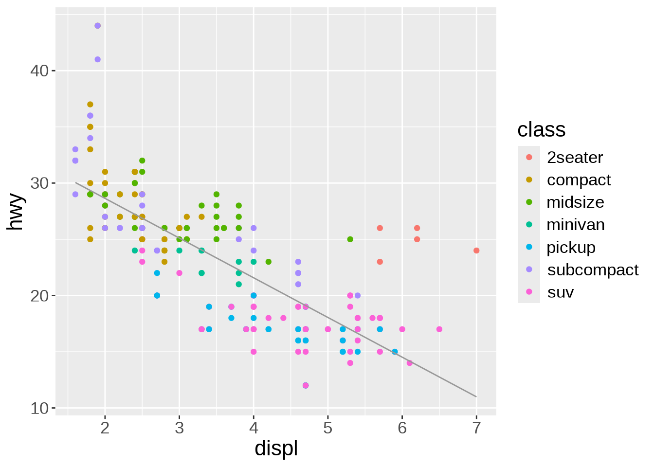 ggplot(mpg, aes(x = displ, y = hwy)) +