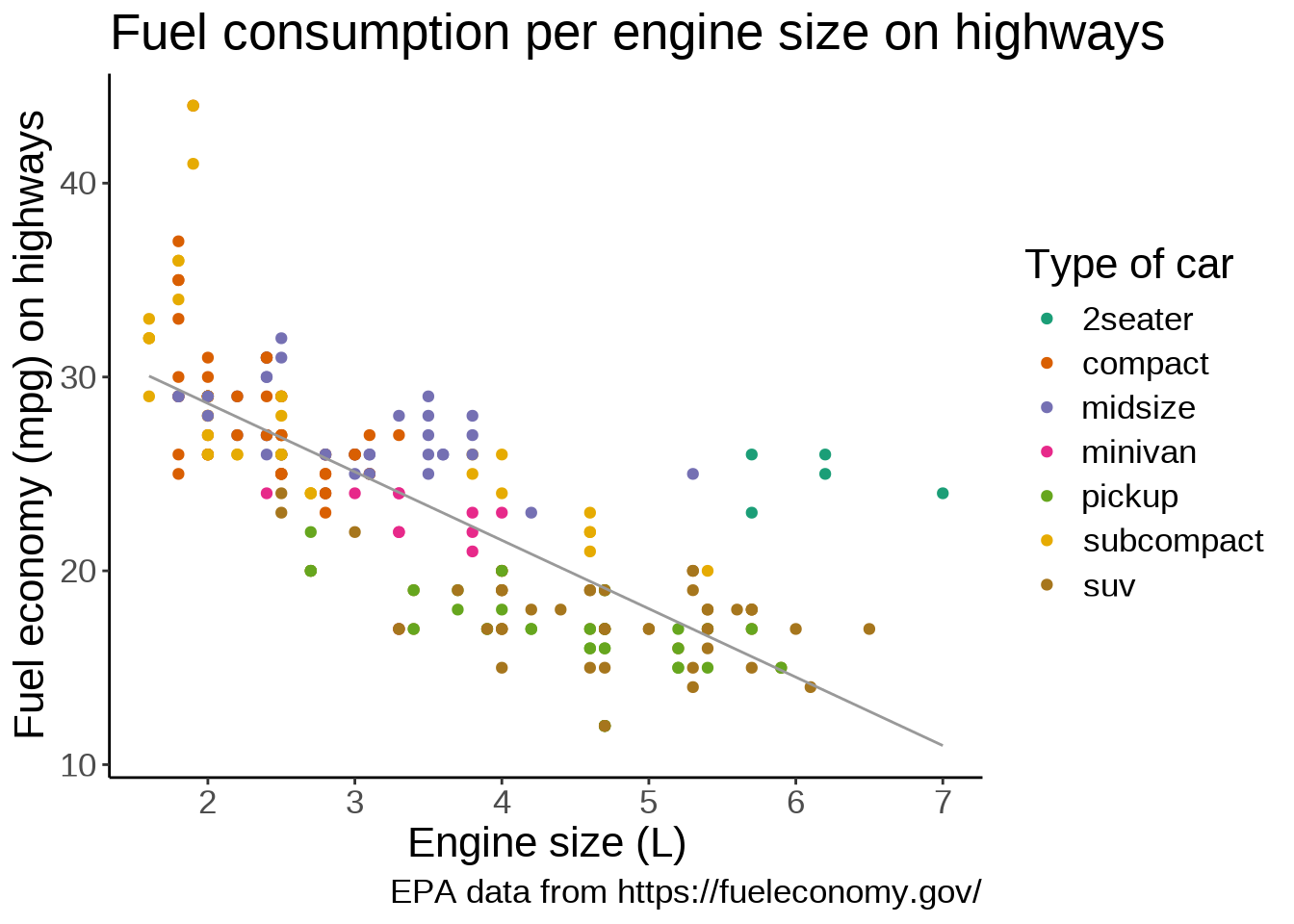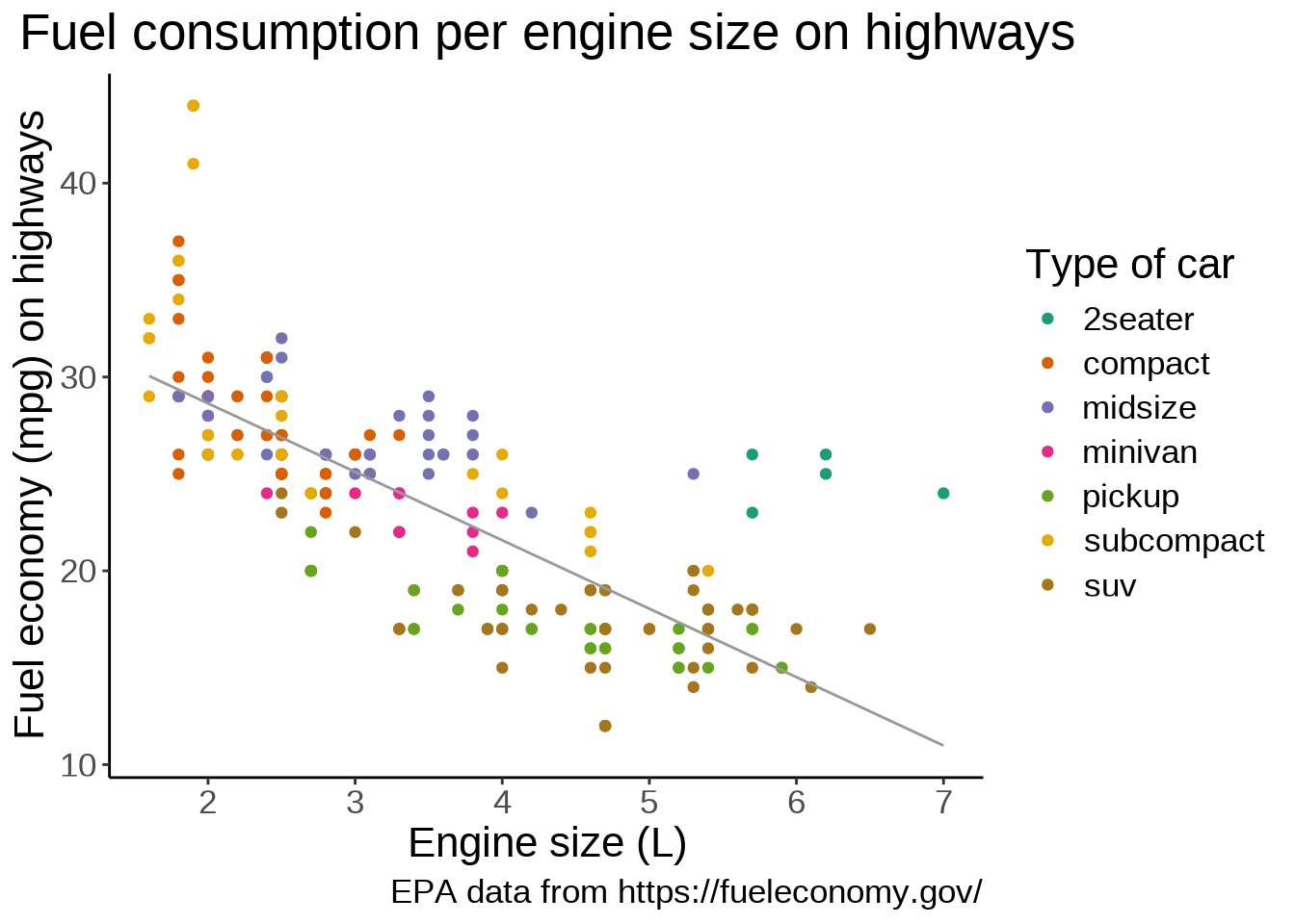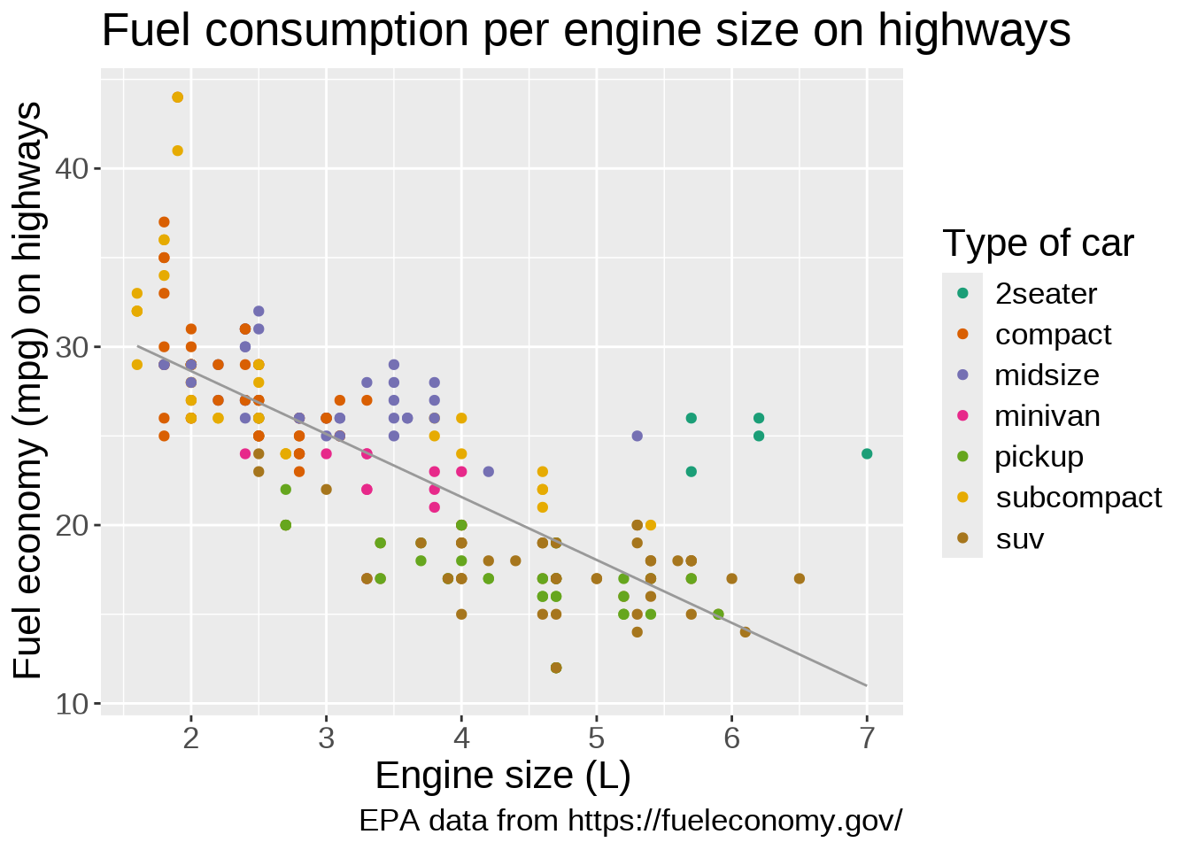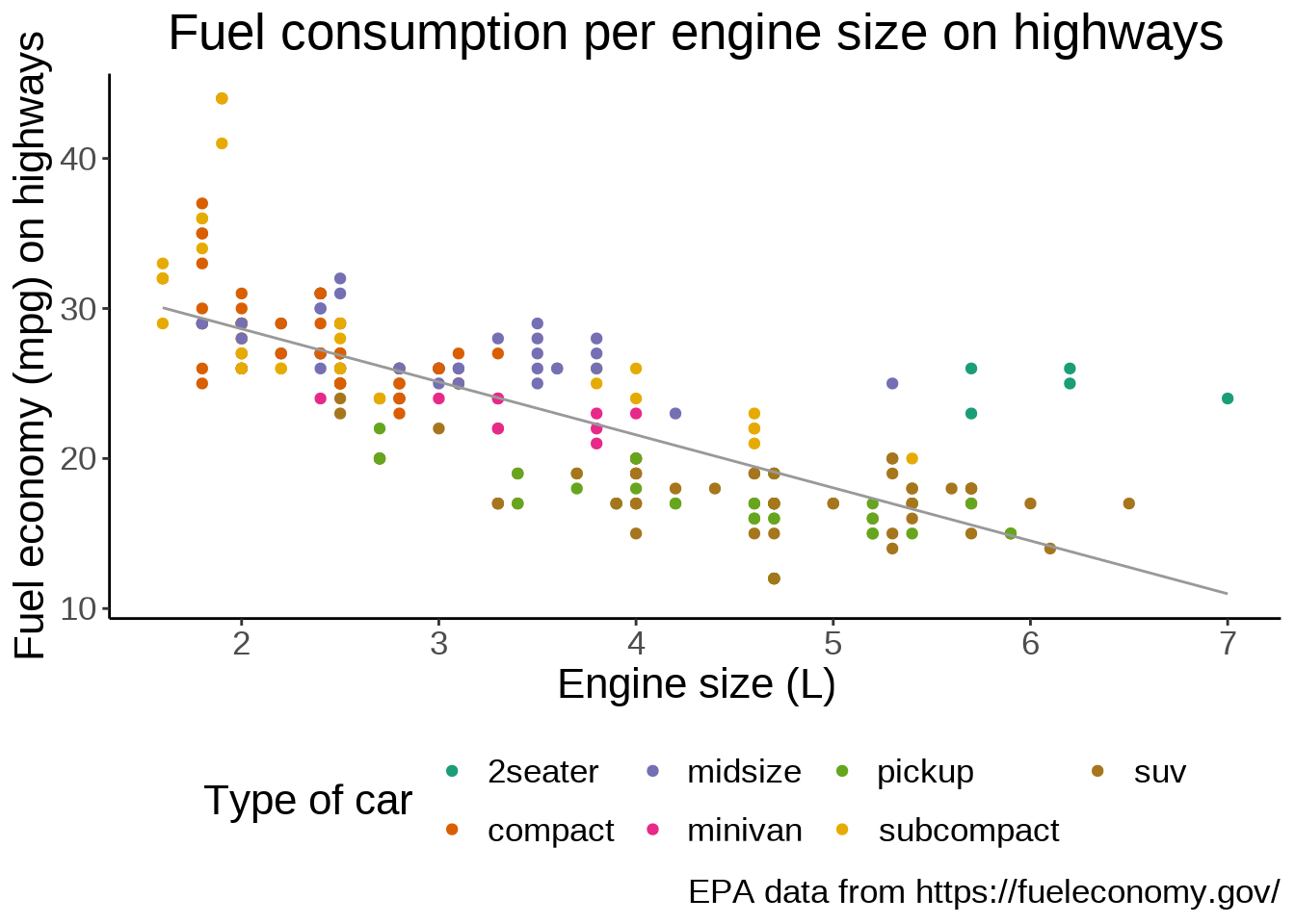 title = "Fuel consumption per engine size on highways",