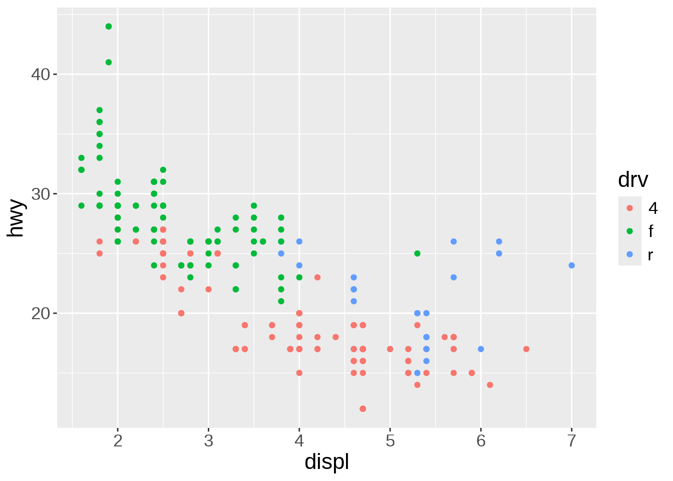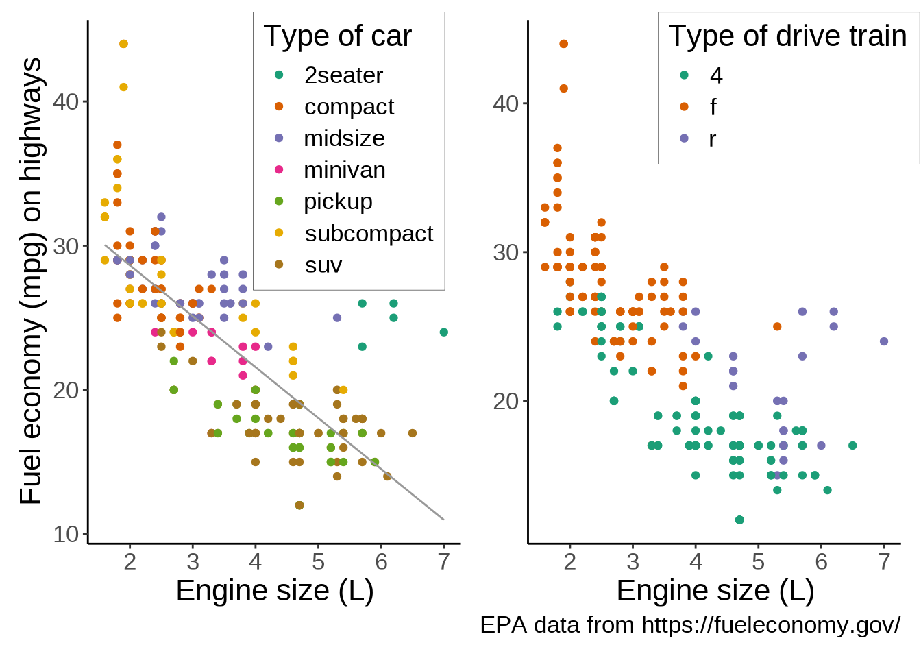 We can colour-code the points in the scatterplot based on the drv variable, showing the lower fuel efficiency of 4WD vehicles: