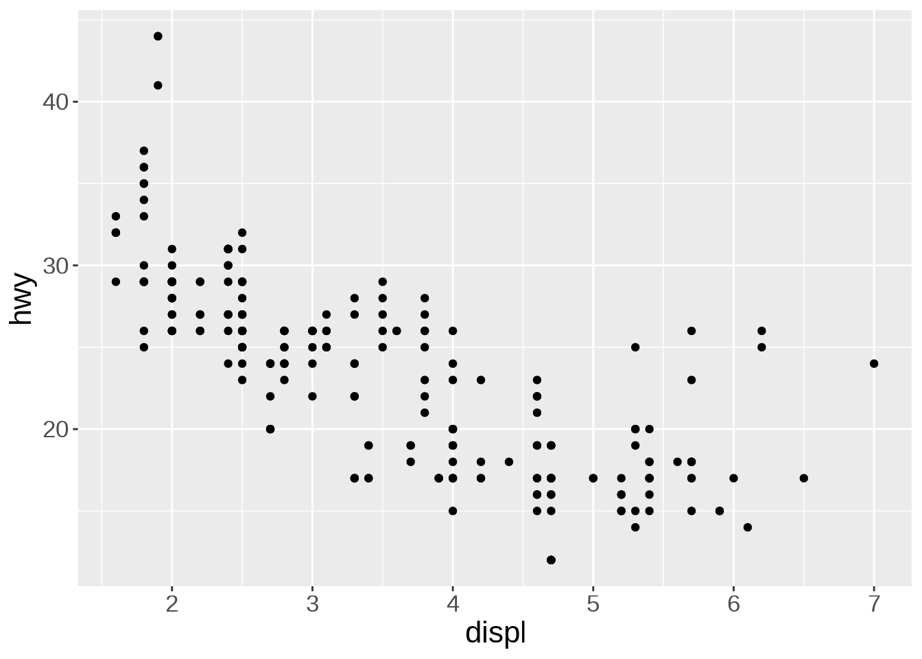 ggplot(mpg, aes(x = displ, y = hwy)) + # First plot