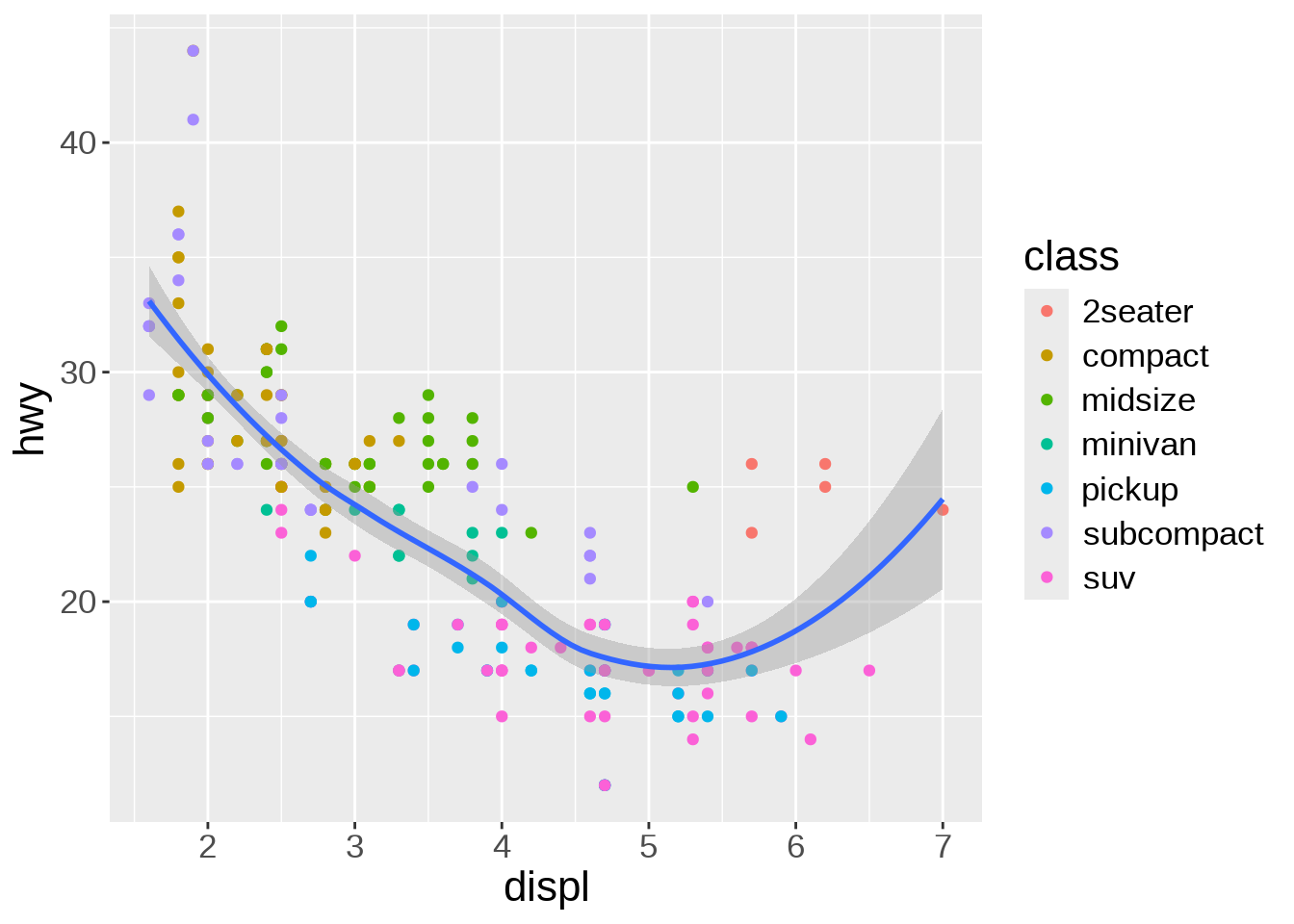 Multiple “geoms” can be added on top of each other. For instance, we can add a smoothed conditional means function that aids at seeing patterns in the data with geom_smooth():